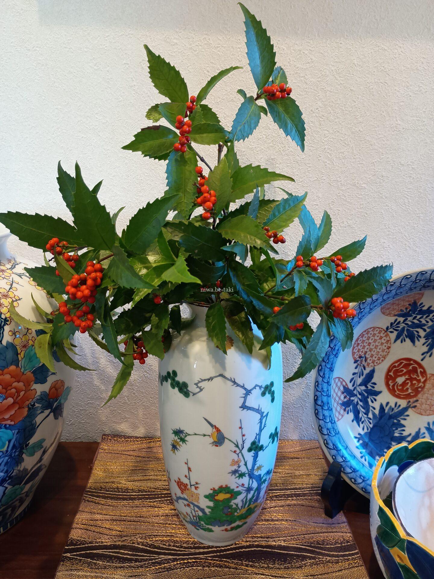 お隣さんからいただいた、千両(こぼれ種から生長した苗です) 剪定したので、玄関に飾りました。